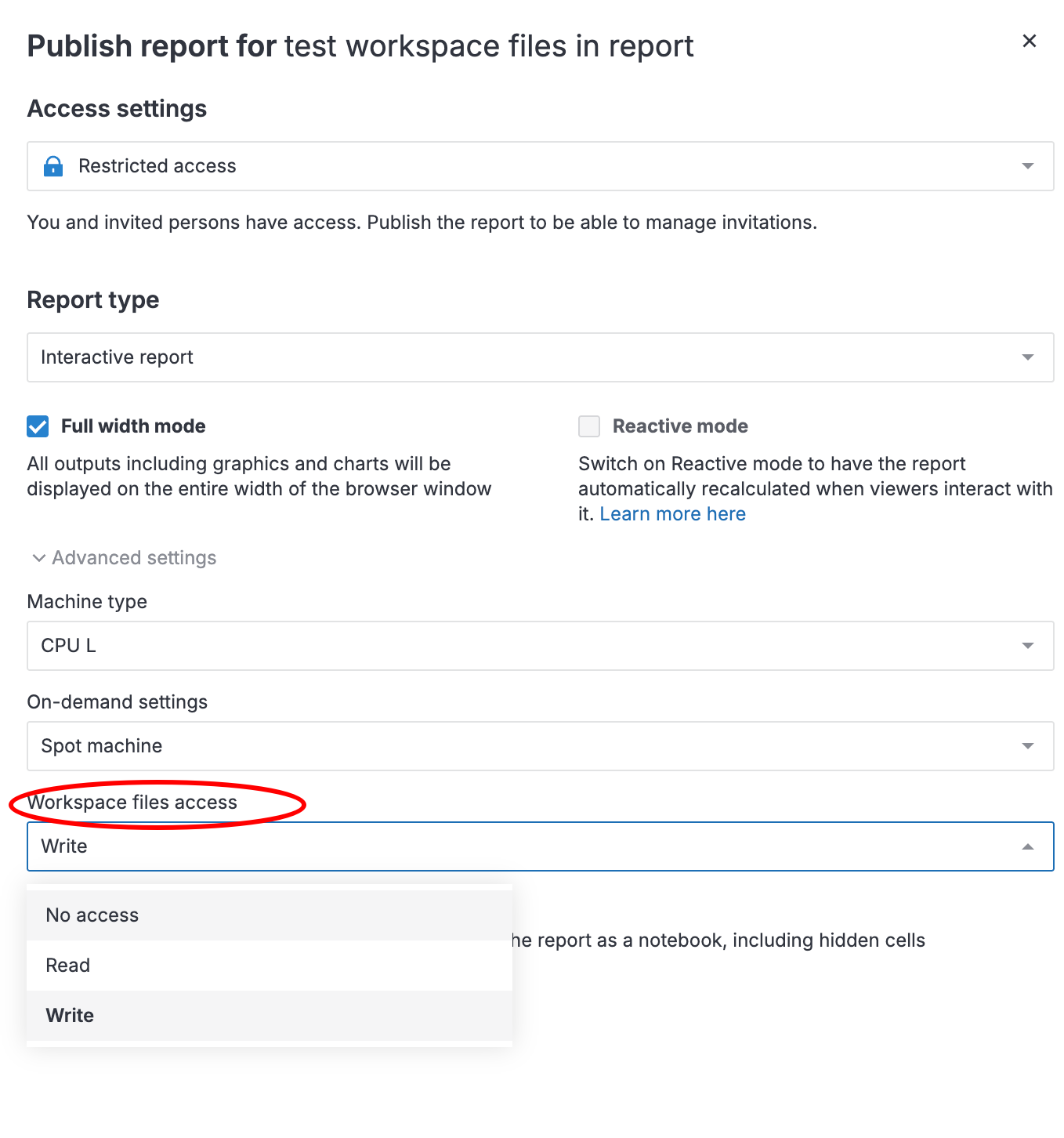 Around 6 month ago I published an interactive python report that used workspace files. If I open exactly that report now, the interactivity works as it should (you select a dataset from the workspace folder, the report proceeds with reading this data and doing stuff). However, if I clone the underlying notebook and try to publish the report again, switching to interactive mode reveals the following message: “Workspace files cannot be accessed for reports